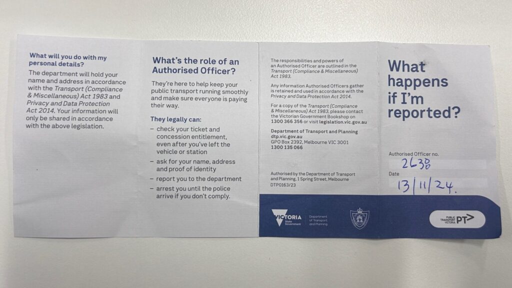 そんな中、乗車した駅の次の駅でまさかのインスペクターの乗車。乗車後すぐにmykiをタッチしなかった私が悪いのだけれども、彼らにレポートされました。